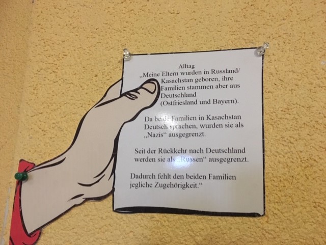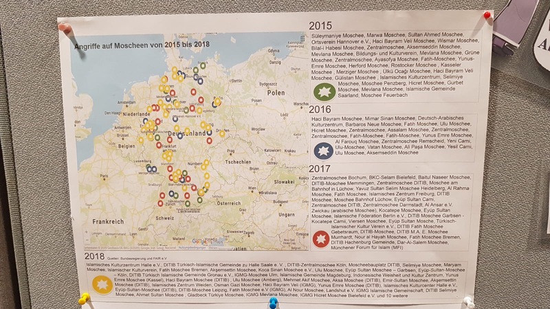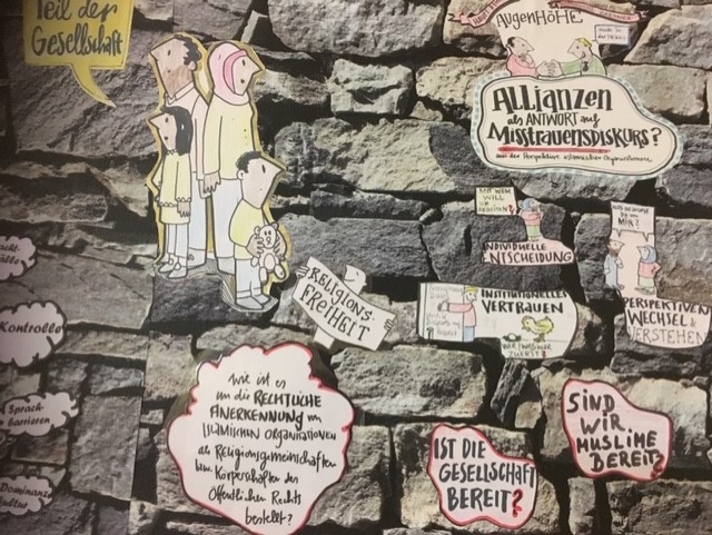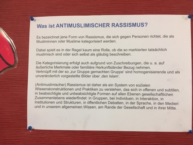 Frau Ibrahim betonte, dass diese Ausstellung von Rassismus betroffenen Muslimen eine Stimme geben soll, die selten gehört wird. Ausgestellt werden Texte, Bilder, Zeichnungen und Erzählungen, die die Besucher gegen Diskriminierung sensibilisieren sollen. Ebenfalls gibt es hierzu eine Schreibwerkstatt. Die Ausstellung ist noch bis Ende April in der Moschee und kann besichtigt werden.