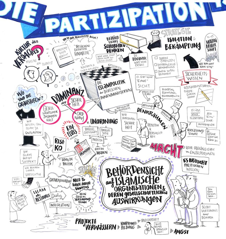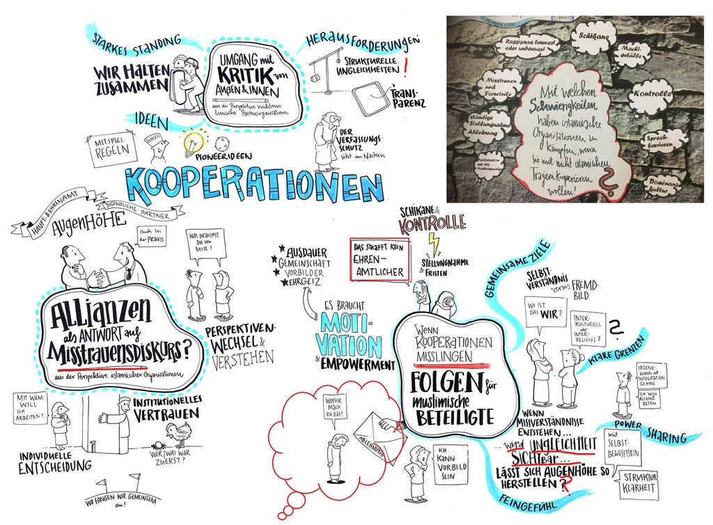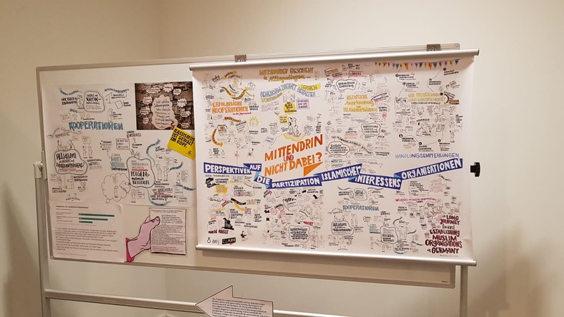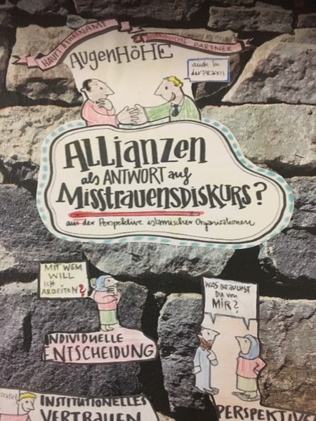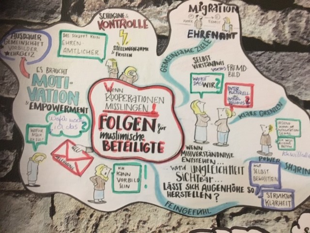 Neben der Besichtigung der Moschee führte Frau Julya Ibrahim Generalsekretariat des IZG, die Gäste durch eine Ausstellung mit dem Thema „Antimuslimischer Rassismus". Sie stellte anhand von Beispielen dar, wo Gemeindemitgliedern im Alltag Ablehnung oder gar offener Rassismus begegnen. Dabei wurde deutlich, dass es hilfreich sein kann, einen Perspektivwechsel vorzunehmen und das eigene Verhalten zu reflektieren, um die andere Seite zu verstehen.